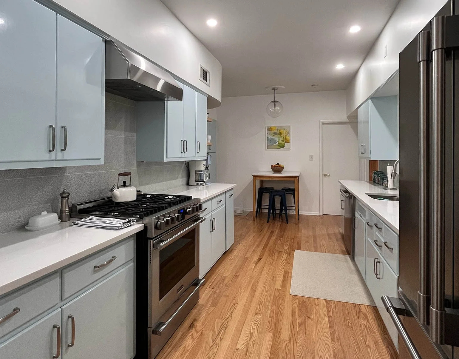 With each home renovation project, we develop a detailed and efficient scope of work tailored to both the client and our subcontractors. For this project, the majority of the transformation centered around refinishing the kitchen cabinets, which required a carefully phased approach.